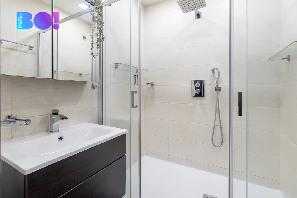 Velmi příjemně je řešena také koupelna — najdete zde neobvykle prostorný sprchovací kout, jaký se v panelových bytech běžně nevidí. Praktickým úpravám napomohlo zazdění jednoho průchodu do kuchyně, díky čemuž vznikl úložný prostor a místo pro pračku i sušičku.
