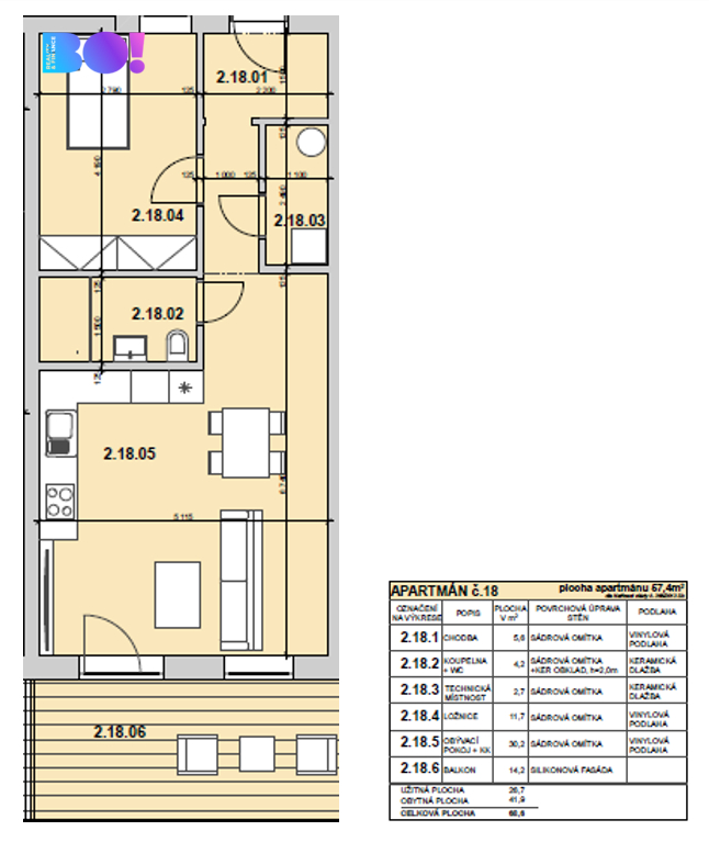 Kompletně nový a plně vybavený apartmán 2+kk 57,4 m² a terasa 14,2 m².