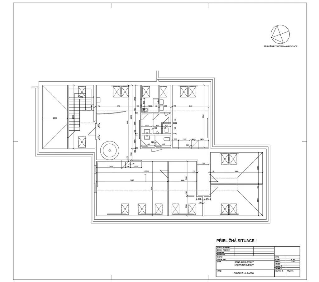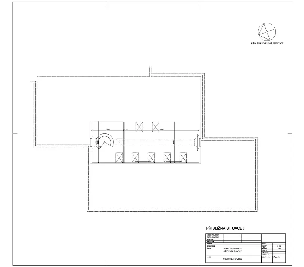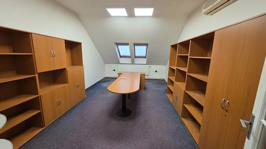 - Nad prvním patrem naleznete nadstavbu s částečně šikmými stěnami. Tento prostor byl užíván jako kancelář či zasedací místnost, je dostatečně prosvětlen střešními okny a přístupný po točitém schodišti.