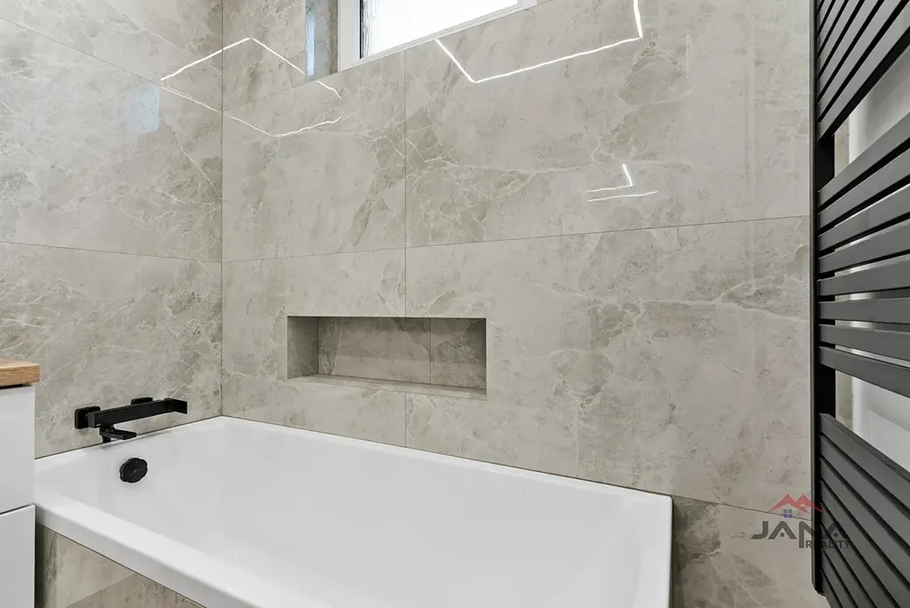 Kuchyně je vybavena novou linkou se spotřebiči značky Electrolux a granitovým dřezem. Koupelna disponuje novou vanou s podomítkovou baterií Siko a umyvadlovou skříňkou Aqualine Vega.