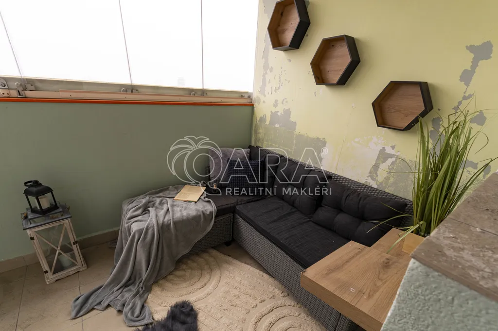 Velkým benefitem je prostorný zasklený balkón (5 m2), která rozšiřuje obytný prostor a nabízí příjemné místo jak pro ranní kávu, tak pro večerní sklenku vína u které si užijete hezký výhled z vyššího patra.