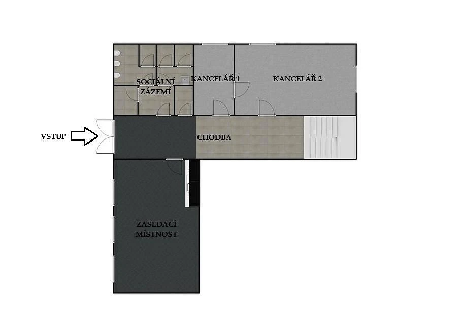 Jedná se o dvě samostatné kanceláře o velikosti cca 38 m² a cca 12 m², které se nachází v přízemí budovy. Větší místnost může sloužit jako hlavní kancelářský prostor a menší místnost jako zázemí pro další pracovní místo, archiv či sklad dokumentů. Obě místnosti jsou světlé. Hlavní kancelář je nově vybavena malou kuchyňskou linkou s dostatečným úložným prostorem a dřezem. Menší kancelář se nabízí bez vybavení. Na chodbě jsou společné prostory jako je WC nebo zasedací místnost, kterou si lze pronajmout za poplatek. Zasedací místnost je vybavena velkým stolem se židlemi, křesly, televizemi a dalším nábytkem včetně kuchyňské linky s dřezem a lednicí.