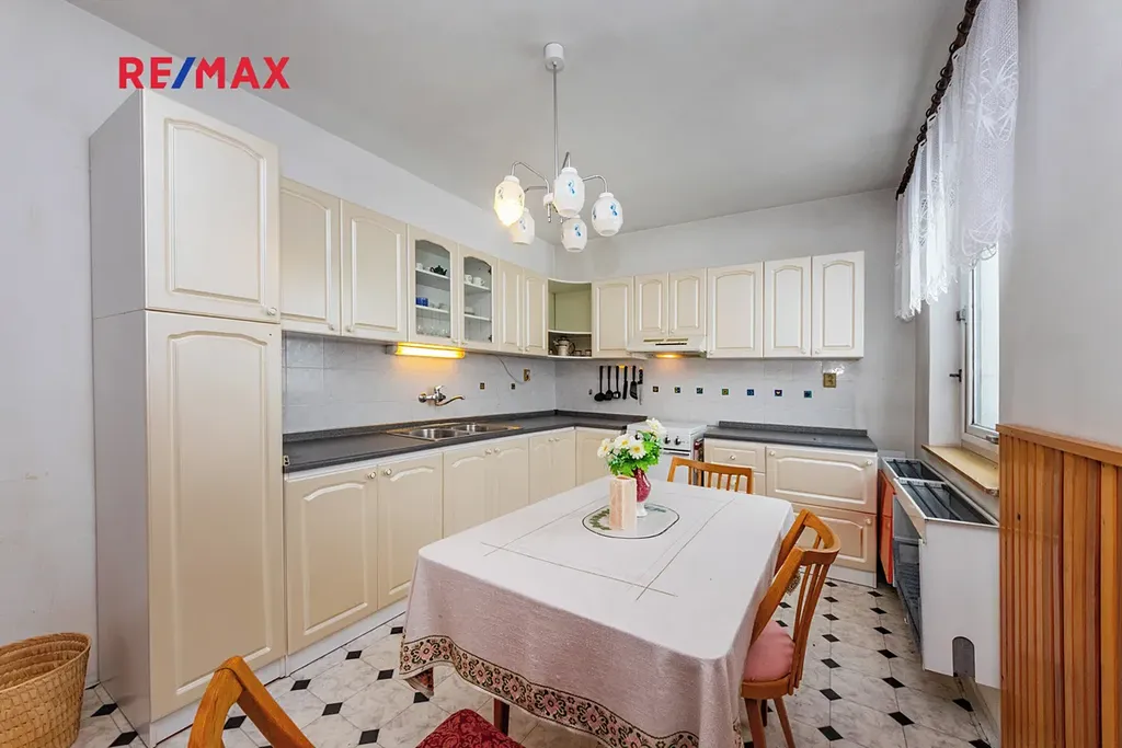 Suterén (80 m2): chodba a 6 místností – černá kuchyně, kotelna, sklad uhlí a další skladové prostory.