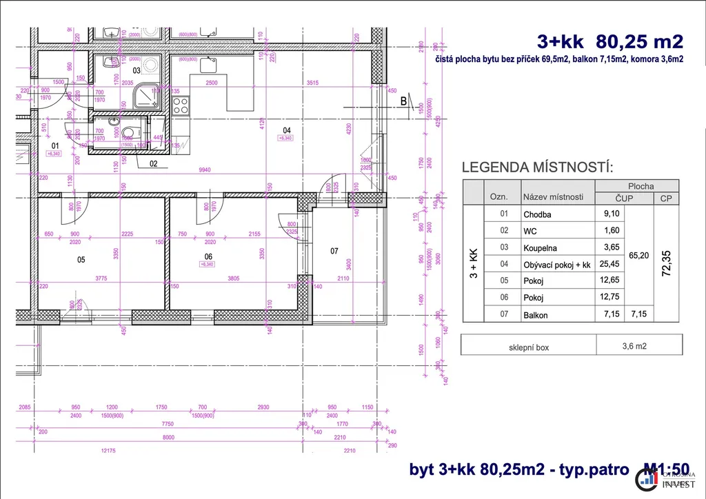 Byt se nachází ve 3. nadzemním podlaží domu s výtahem a nabízí celkovou plochu 69,5 m², k tomu lodžii o výměře 7,15 m² a sklepní kóji 3,6 m². Velkým benefitem jsou dvě parkovací stání přímo u domu, která jsou součástí prodeje.