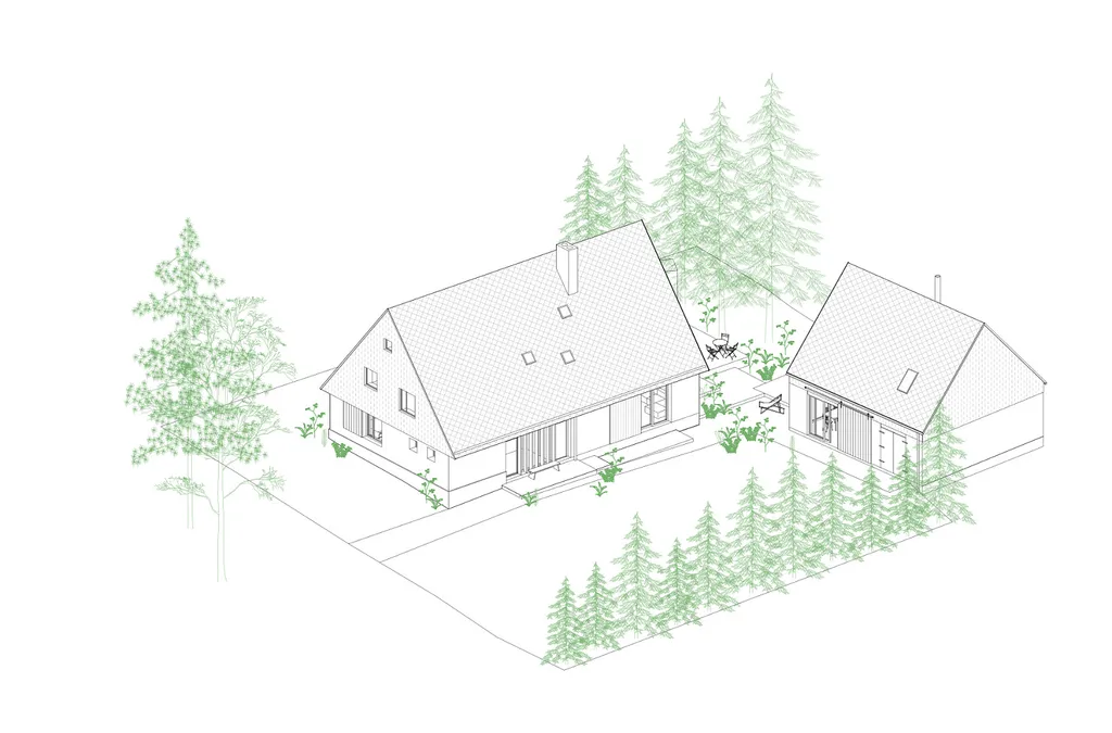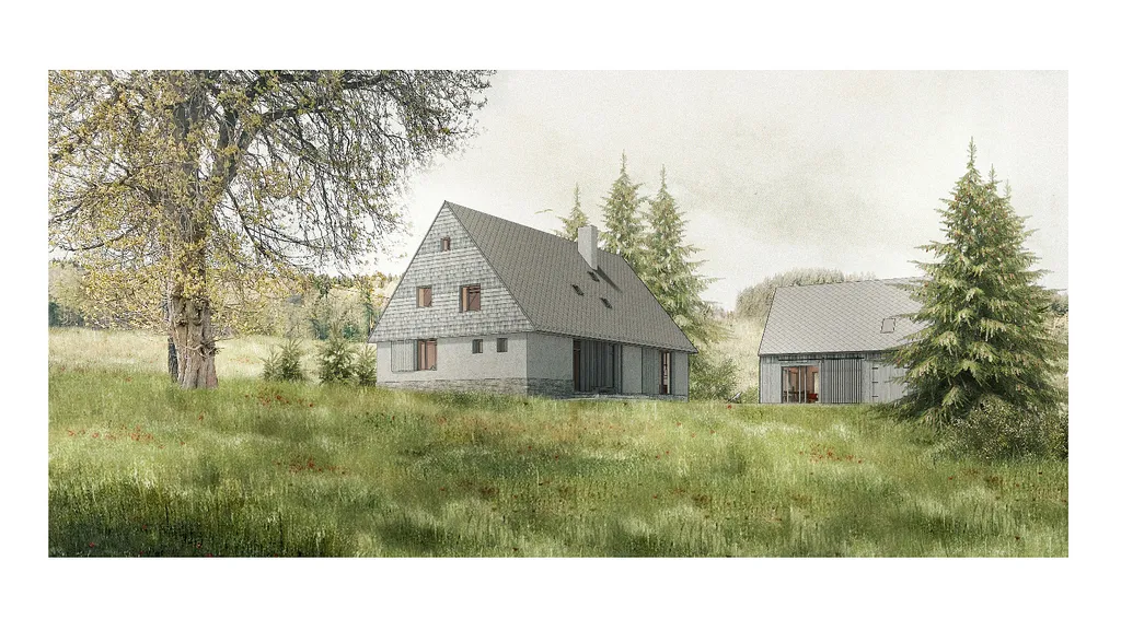 Majitel má k dispozici stavební projekt na realizace domu a domu pro hosty. viz vizualice a stavební povolení platné do 12/2027.