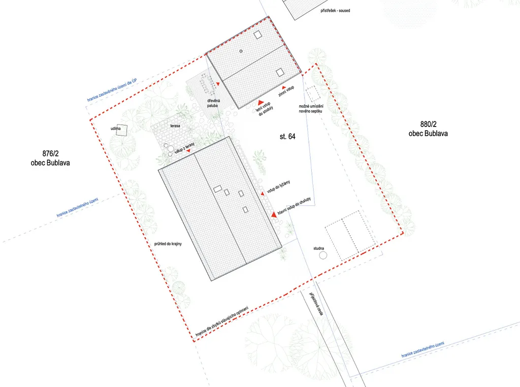 Součástí nabídky je projekt stavebních úprav, který si nechali zpracovat současný vlastník. Kupující tak může navázat na již připravený záměr, nebo realizovat vlastní představu o využití pozemku. Dále je na pozemku platné stavební povolení do 12/2027.