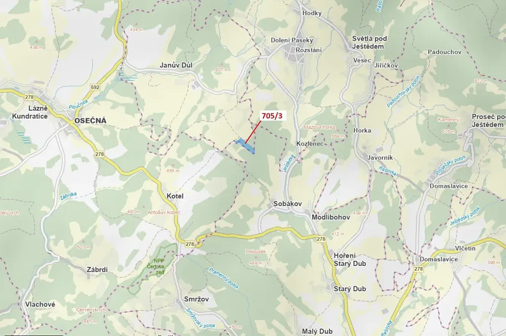 Lesní pozemek o výměře 27 787 m2, parcelní číslo 705/3, podíl 1/1, katastrální území Janův Důl, obec Janův Důl, obec s rozšířenou působností Liberec, okres Liberec, Liberecký kraj. Po těžbě.