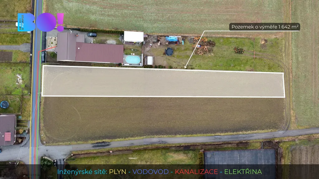 Na hranici pozemku o velikosti 1642 m² se nachází inženýrské sítě, plyn i vodovodní řad veden v asfaltové cestě cca 3 m od hranice pozemku, na elektřinu je možno se napojit z elektrického sloupu přímo na hranici tohoto pozemku, což výrazně usnadňuje napojení budoucí stavby. Napojení na kanalizaci je možné se souhlasem majitele této kanalizace, jinak vybudování své čističky odpadních vod, dešťová voda jako trativod, jsou řešení odvodnění a likvidace odpadních vod na pozemku.