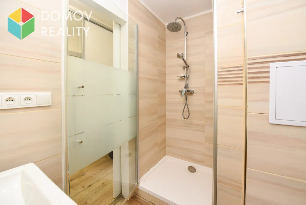 Dominantou bytu je obývací pokoj, který je elegantně rozdělen polopříčkou na obytnou a spací část. Vzniká tak oddělený prostor pro postel a soukromí, aniž by došlo ke zmenšení hlavní místnosti. Kuchyně je vybavena moderní linkou se spotřebiči – indukční varnou deskou, elektrickou troubou, mikrovlnnou troubou a digestoří s odtahem mimo byt. Koupelna nabízí sprchový kout a je řešena prakticky a úsporně. V bytě jsou plovoucí podlahy, vytápění je dálkové. K jednotce náleží také sklepní kóje, která poskytuje další úložný prostor.