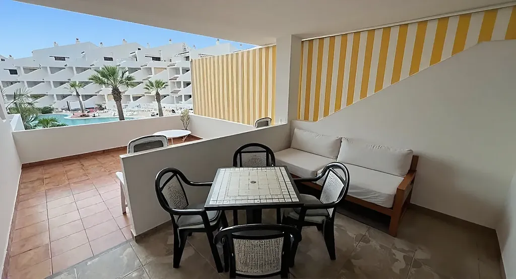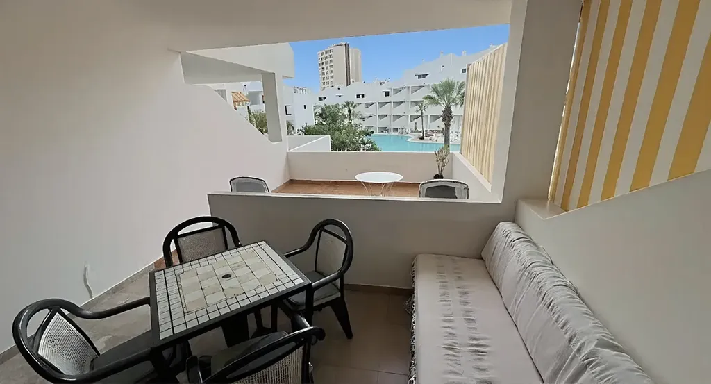 K prodeji nabízíme velmi pěkně udržovaný apartmán s 1 ložnicí a 1 koupelnou, nacházející se v oblíbeném rezidenčním komplexu Paloma Beach v Los Cristianos, pouhé 2 minuty od pláže. Apartmán se nachází v 1. patře budovy s výtahem, má celkovou plochu 102 m² a nabízí velkorysý prostor, který je ideální jak pro trvalé bydlení, tak pro druhý domov u oceánu. Dispozice zahrnuje světlý obývací pokoj s jídelní částí a otevřenou kuchyní s barovým pultem. Z obývacího prostoru je přímý vstup na prostornou dvojitou terasu orientovanou na západ, kde si můžete užívat odpolední a večerní slunce a příjemné výhledy směrem k bazénu. Součástí bytu je velká ložnice s vestavěnými skříněmi a prostorná koupelna se sprchovým koutem. Nemovitost se prodává plně zařízená a vybavená, připravená k okamžitému nastěhování. Komplex Paloma Beach je velmi dobře udržovaný a nabízí fantastické komunitní bazény, z nichž hlavní je vyhřívaný, dále lehátka, slunečníky a bezbariérový přístup. Lokalita je výjimečná – restaurace, kavárny, obchody i promenáda jsou v pěší vzdálenosti.