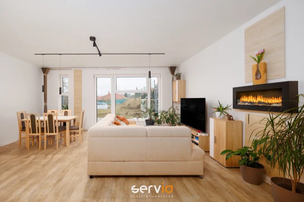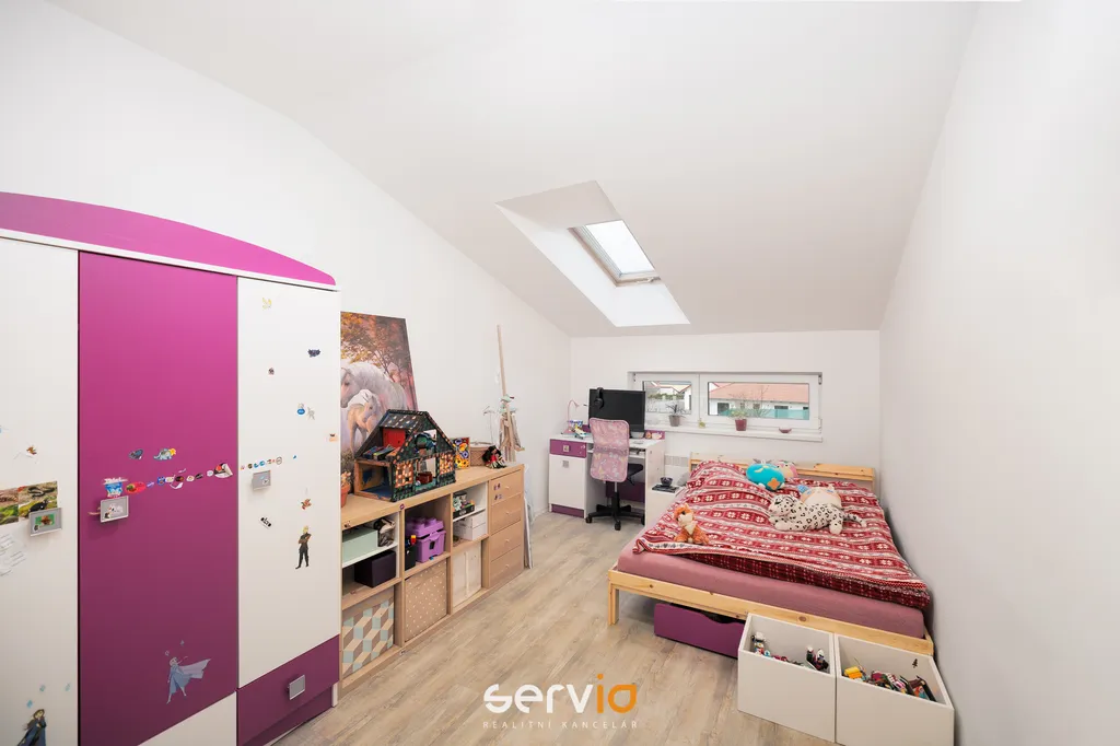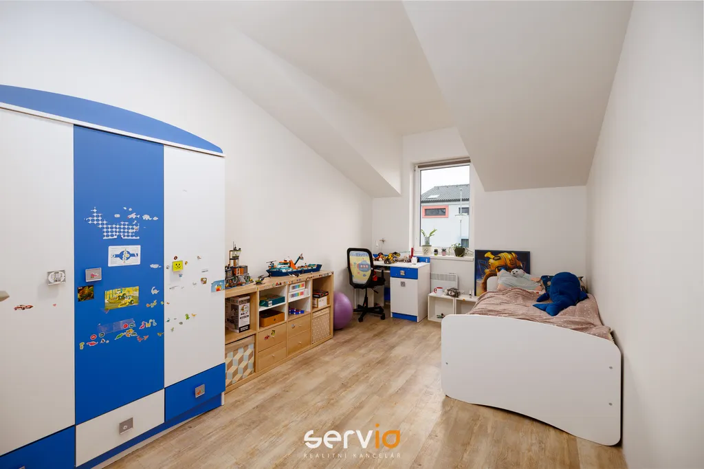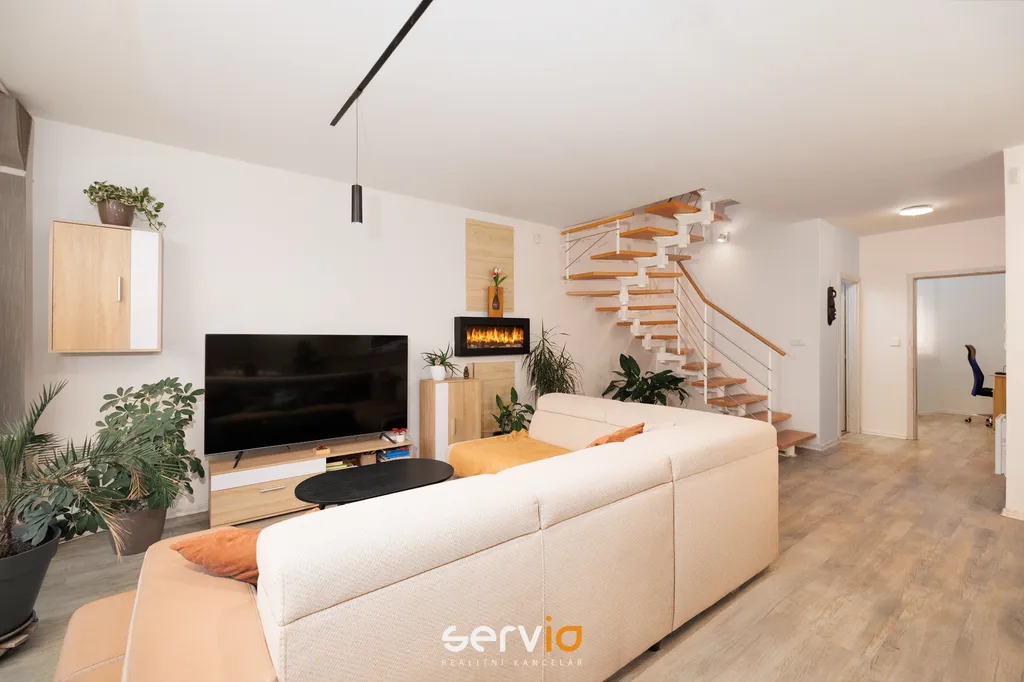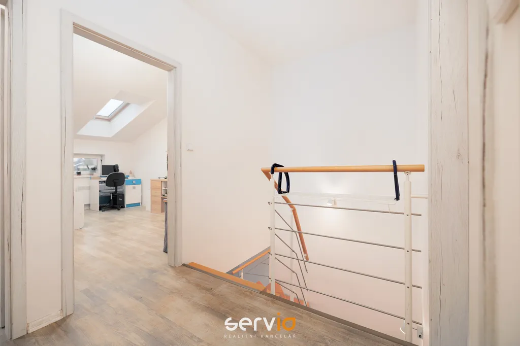 Jedná se o patrový dům o 2.NP v blokové zástavbě rodinných domů mimo hlavní ulici. V přízemí se nachází obývací pokoj s kuchyňským koutem, vstupem na zahradu s terasou, pracovna a WC. V patře zbývající 3 pokoje a koupelna s vanou a WC. Možnost parkovaní na vlastním pozemku až pro 3 auta, z toho 1 kryté za uzamykatelnou bránou.