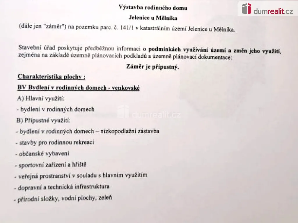 možný prodej pozemku pro výstavbu RD. Jde celkem o 1335 m² pozemku, který je z části oplocený. Na pozemek je přivedena voda a elektřina. Kanalizace je v příjezdové cestě. V současníé době není možné připojení na kanalizaci a to z důvodu kapacitních a také z důvodu záruční lhůty na komunikaci. To vše by mělo být do 5/2028 možné. Zatím je možné umístit jímku na odpadní vodu. Vjezd je možné vybudovat přes stávající oplocení kolem komunikace. Dle předběžné informace o podmínkách využívání území a změn jeho využití je možné bydlení v rodiných domech - venkovské. Zastavitelnost území je 25% a výška domu je přípustná 1 NP+ podkroví. Cenu nabídněte, prosím. Bližší informace u makléře. Ev. číslo: 654665.