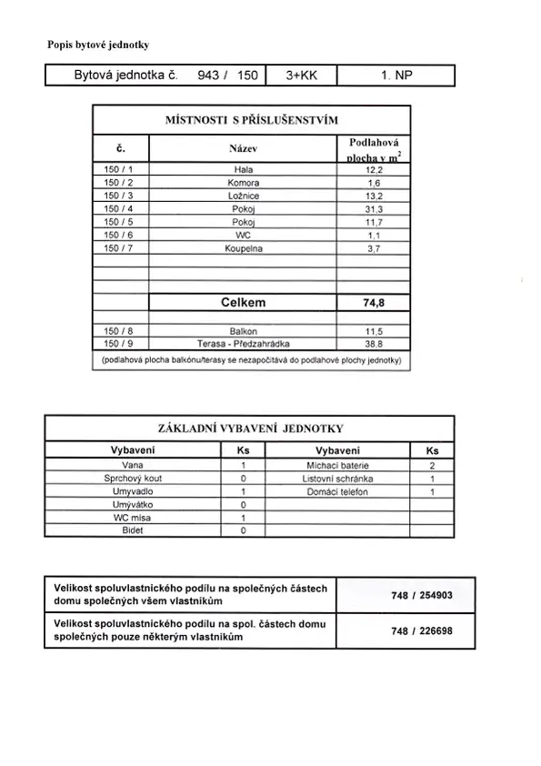 Byt o podlahové ploše 74,8 m2 s vlastní zahrádkou o výměře bezmála 40 m2 a prostorným balkonem o výměře 11,5 m2, se nachází ve zvýšeném přízemí bytového domu postaveného v roce 2008 v ulici Pod Harfou.