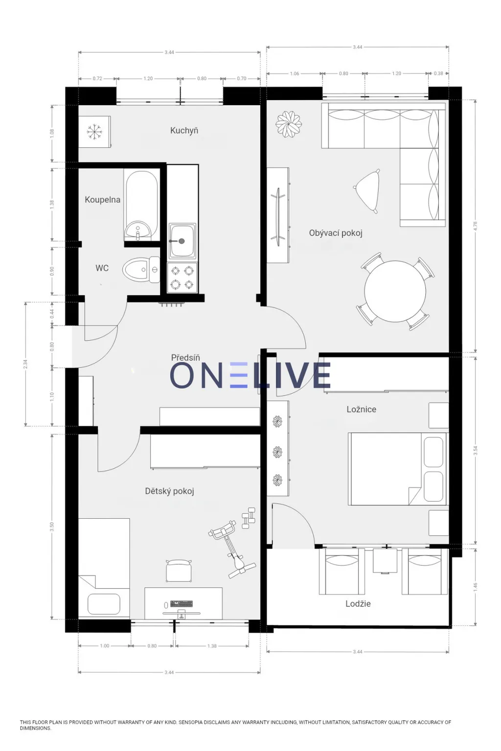 Dispozice bytu je velmi praktická. Po vstupu se nachází prostorná předsíň, ze které je přístup do koupelny s toaletou. Z chodby je dále vstup do samostatného pokoje, vhodného jako dětský pokoj či pracovna, a také do kuchyně a obývacího pokoje. Z obývacího pokoje se vstupuje do dalšího pokoje, ideálního jako ložnice, s přímým vstupem na prostornou lodžii.