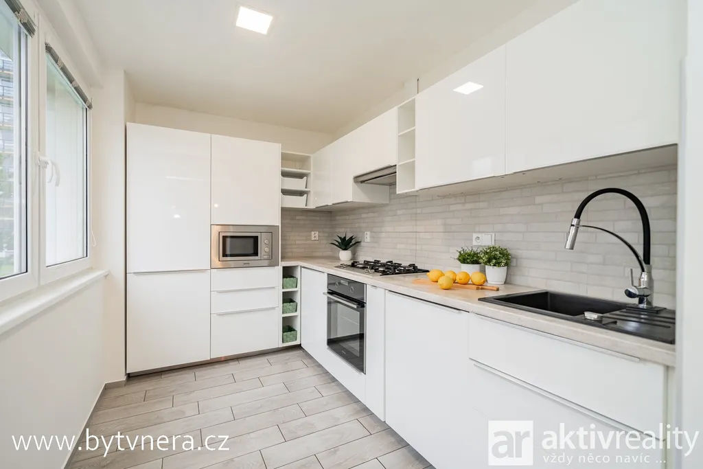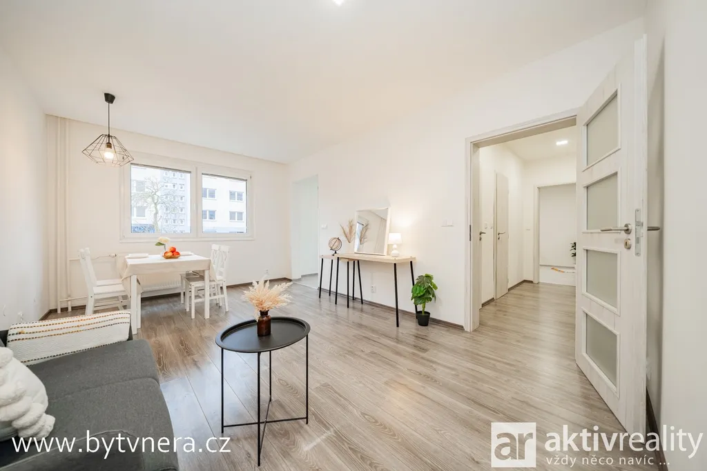 Byt má praktické uspořádání – vstupní chodbu, obývací pokoj propojený s jídelnou a kuchyní vybavenou vestavěnými spotřebiči (plynový sporák Mora, trouba a mikrovlnná trouba Gorenje, lednice), dále prostorný pokoj, samostatné WC a koupelnu s vanou a přípojkou na pračku. Elektřina je v mědi, TV a internet jsou řešeny datovým kabelem. Stropy jsou sníženy sádrokartonem, na oknech jsou rolety a žaluzie.