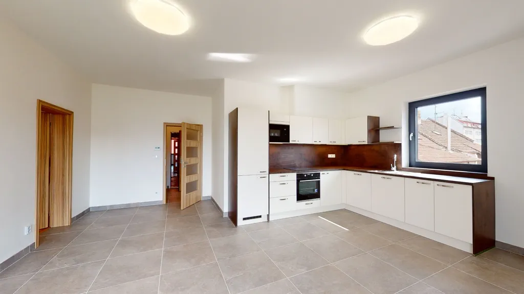 Dominantou bytu je prostorný obývací pokoj s kuchyňským koutem a vstupem na velký balkon přes široký posuvný hliníkový portál. Moderní kuchyňská linka (viz foto z totožného bytu o patro níže) je vybavena klasickou i mikrovlnnou troubou, indukční varnou deskou, myčkou nádobí, odsavačem par s dálkovým ovládáním, chladničkou s mrazákem a oknem s výhledem na Burianovo náměstí.