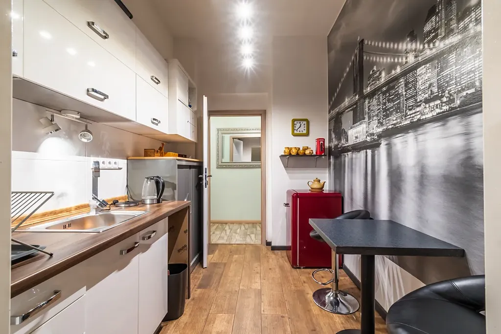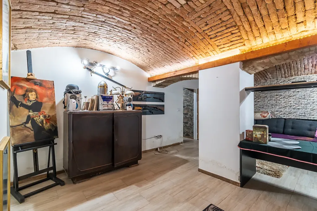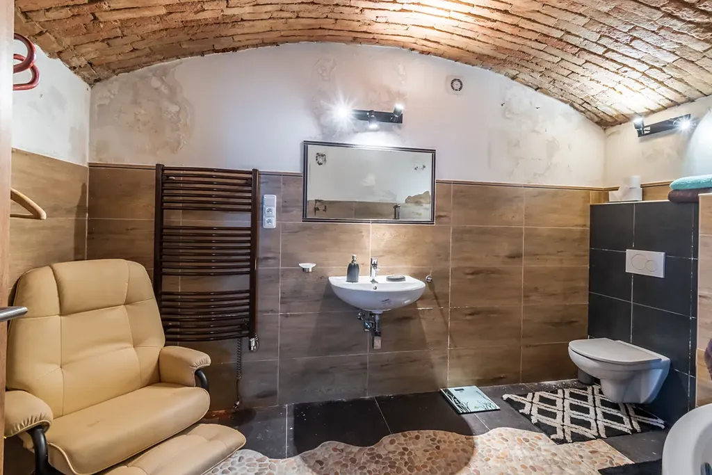 Bytová jednotka nabídne tři průchozí pokoje, zařízenou kuchyň a koupelnu s WC. Ateliér nabízí obývací pokoj s přípravou pro kk, koupelnu s rohovou vanu + WC, sklad a vinný sklípek. Tento prostor je propojený vnitřním schodištěm. Podlahovou krytinu tvoří keramická dlažba.