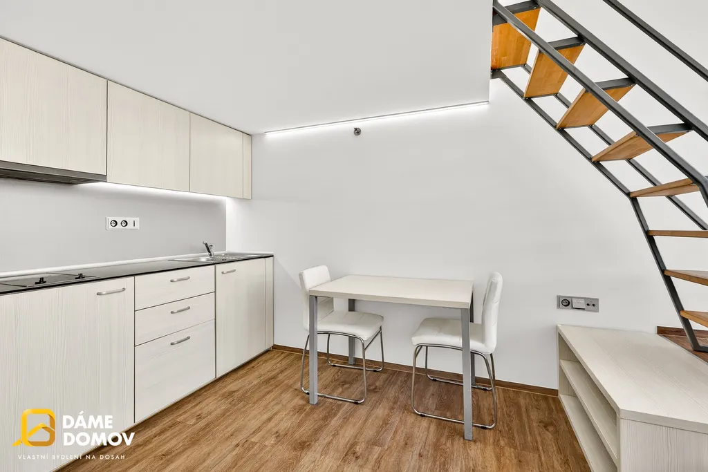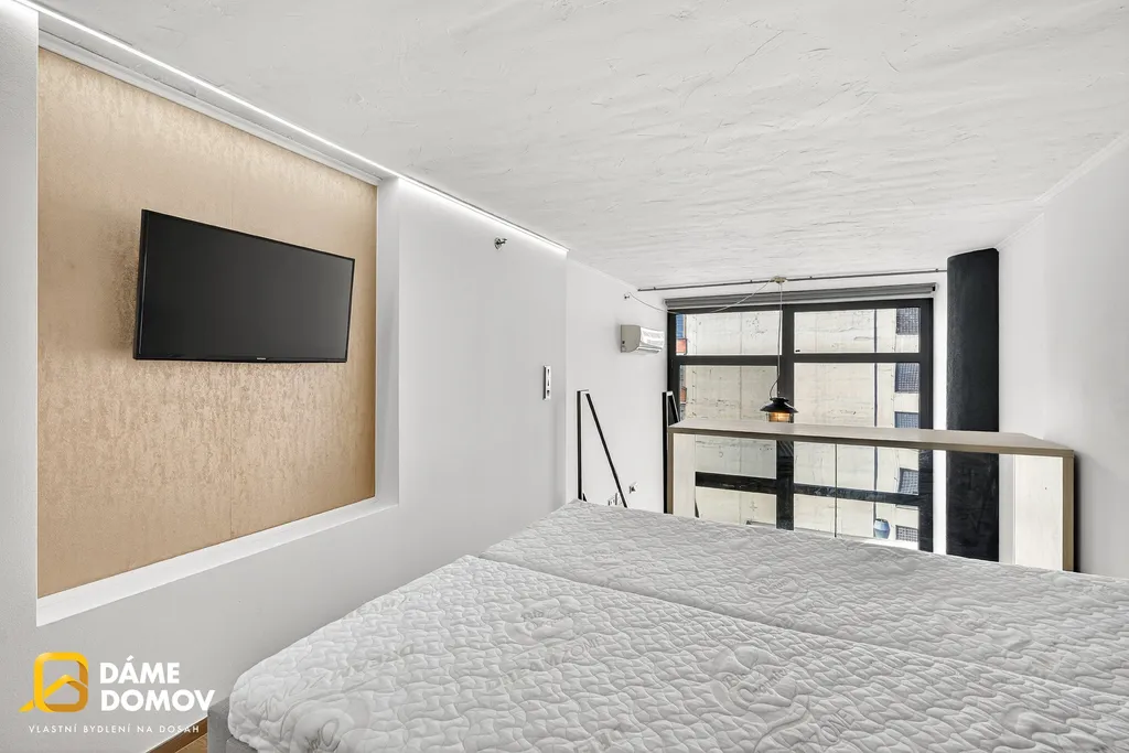 Byt je loftový a je dispozičně řešen jako 2+kk, kdy ve spodní části bytu je koupelna, šatna, kuchyň, obývací pokoj a v horní části pak ložnice s části pro pracovnu a vestavěné skříně.
