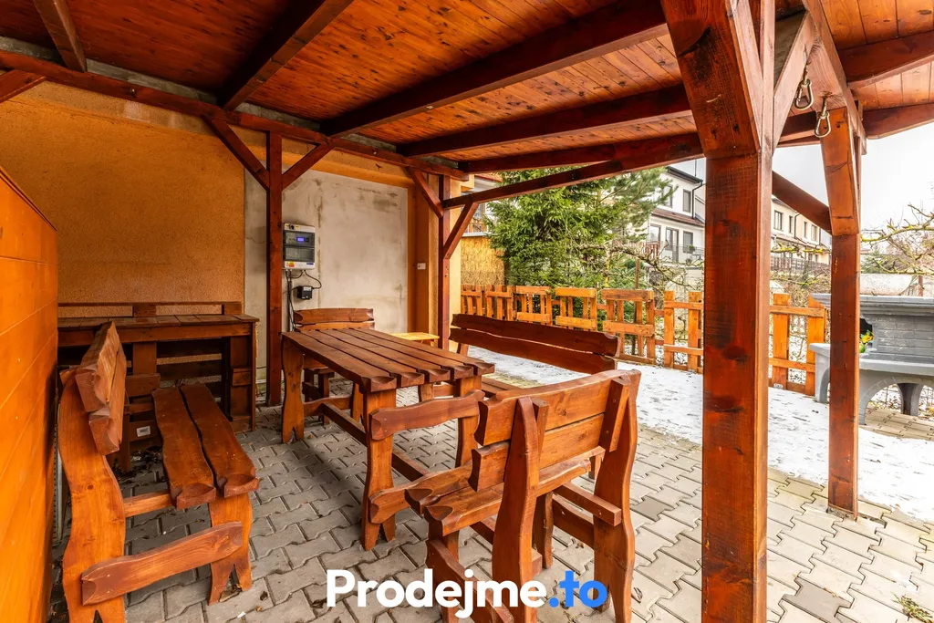 Venkovní část domu poskytuje příjemné prostředí pro každodenní fungování i odpočinek. Navazuje na ni terasa u jednotky 5+1, na pozemku je dále pergola pro posezení, zahradní domek a krytý bazén, který prodlužuje koupací sezónu a zvyšuje komfort bydlení. Zahrada je celá dlážděná, což ocení zejména ti, kteří nechtějí trávit čas náročnou údržbou.