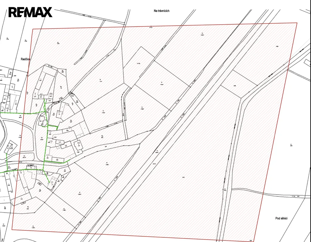 Jedná se o pozemek o celkové výměře 4.320m2 v okrajové části obce Radčice u Vodňan, na trase České Budějovice - Písek. Pozemek rovinatého terénu je s výměrou cca 2.700m2 určen dle územního plánu k výstavbě rodinných domů, kde min. plocha st. pozemku činí 800m2. Je zde možné geometrické rozdělení na 3 samostatné parcely s obslužnou komunikací. Zbylá část pozemku není určena k výstavbě viz snímek mapy. V severozápadní části pozemku prochází kanalizace, do které je možné napojení, elektřina i obecní vodovod jsou v dosahu. Příjezd po zpevněné asfaltové obecní komunikaci. Pro více informací volejte makléře nabídky. Prodávající si vyhrazuje právo vybrat kupujícího na základě jím zvolených kritérií.