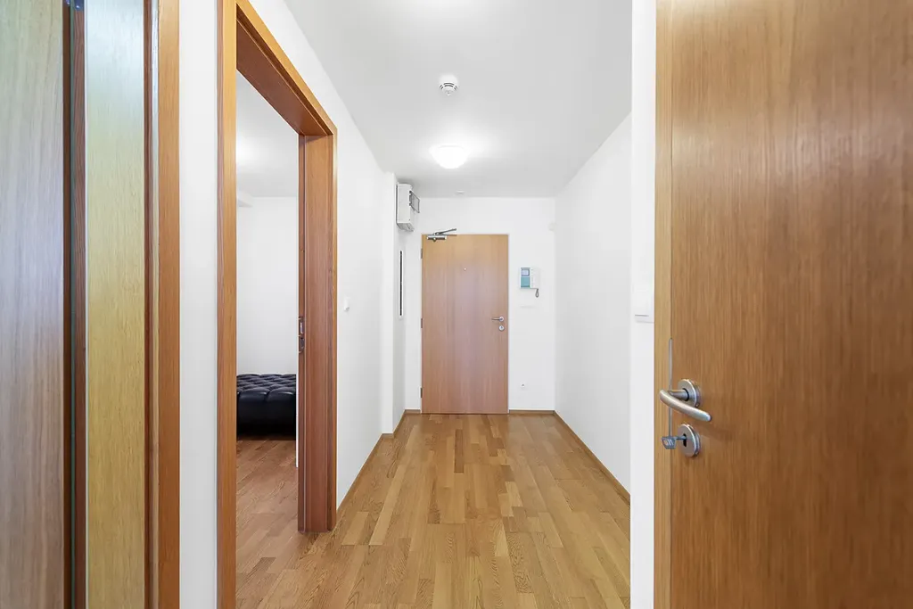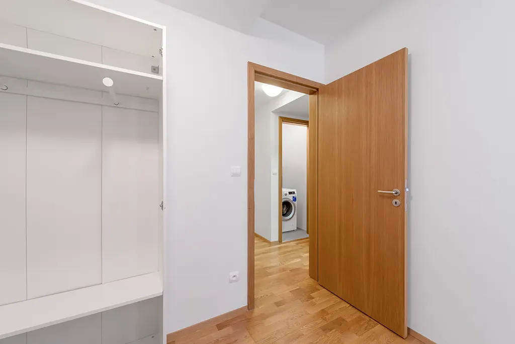 Obývací pokoj 34 m² velký a světlý, s východem na jednu z teras. Je vybaven nábytkem – v případě potřeby jej můžeme odstranit, pokud máte vlastní. Ložnice je rozdělena na dvě části – část s postelí a nočními stolky a druhou část, která slouží jako úložný prostor nebo může být využita jako pracovní prostor. Z ložnice je také výstup na terasu. Koupelna má vyhřívanou podlahu, což zvyšuje komfort užívání. Je komora s pračkou, a samostatné WC.