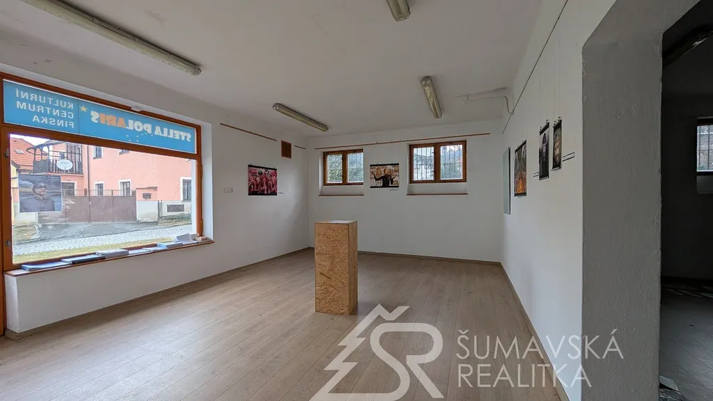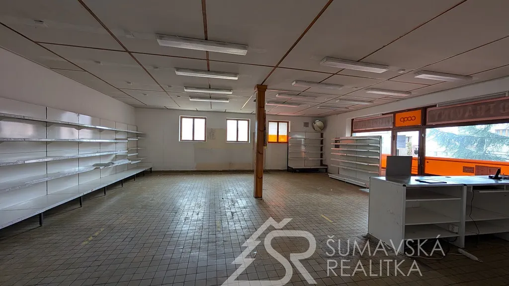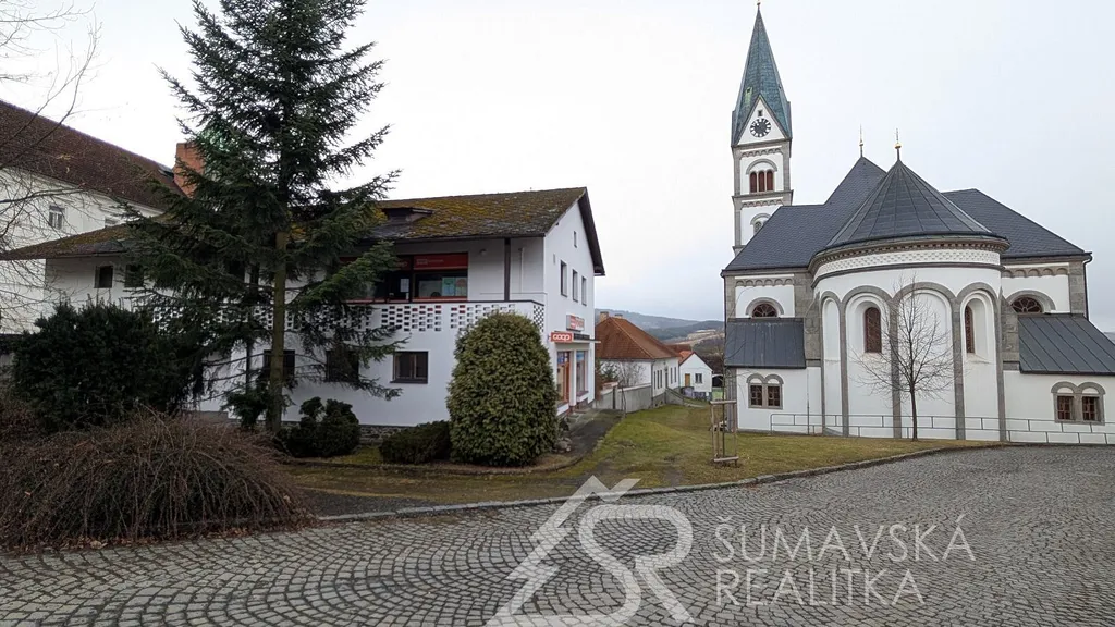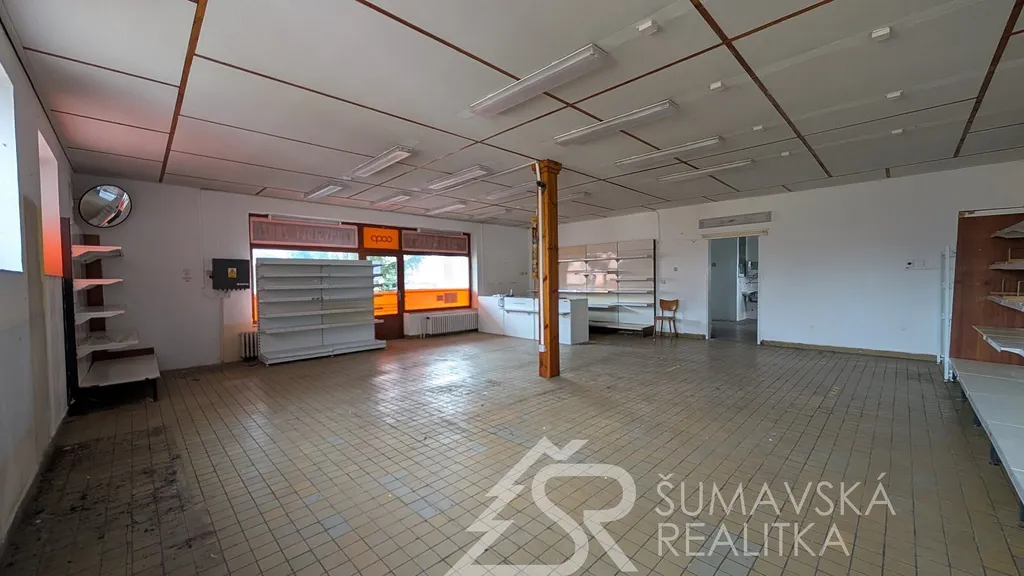 Popis: přímo v centru obce a to mezi kostelem a zámkem se nachází zavedená prodejna potravin. Jedná se o dvoupatrový objekt občanské vybavenosti, kdy v přízemí je jeden nebytový prostor (bývalá masna) který nyní sloužil jako kulturní centrum. V patře je pak rozsáhlý obchod se sklady a zázemím. Budova je klasicky zděná se sedlovou střechou. Celková podlahová plocha je 330 m². Výhoda je dobré umístění v centru obce s vynikající dopravní obslužností, parkovacími místy a v těsném sousedství autobusové zastávky.