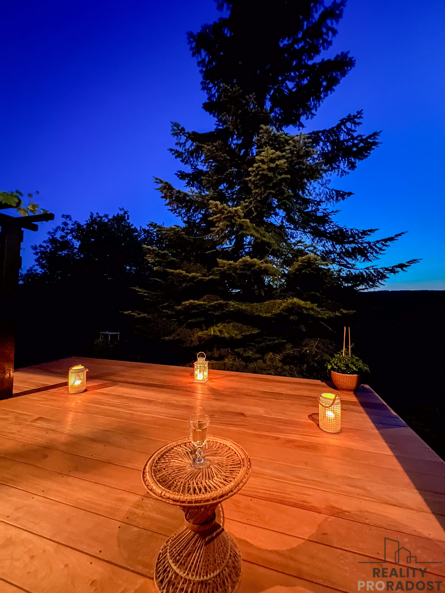 1. LUXUSNÍ ŽIVOT VENKU (Terasa Garapa) Dominantou je zcela nová terasa (dokončeno 06/2025) z prémiového tropického dřeva Garapa s životností desítky let. Součástí je na míru dělaná letní kuchyně. Zde se odehrává život – snídaně na slunci i večerní grilování s výhledem. (Celkový prostor k užívání vč. teras je velkorysých 76 m²).