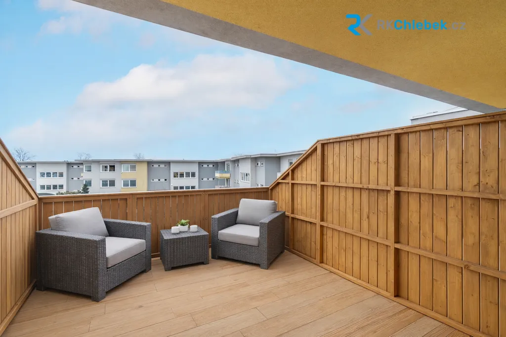 Terasa o velikosti 13 m² je částečně krytá a oddělena dřevěnou zástěnou, což poskytuje dostatek soukromí při venkovním posezení.