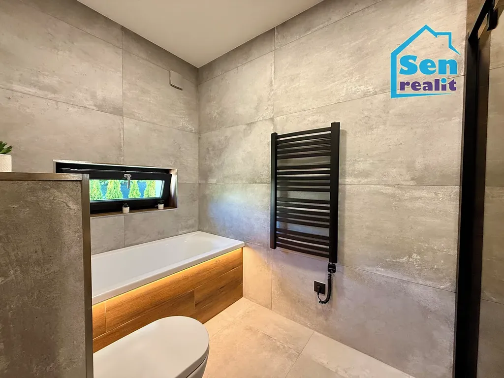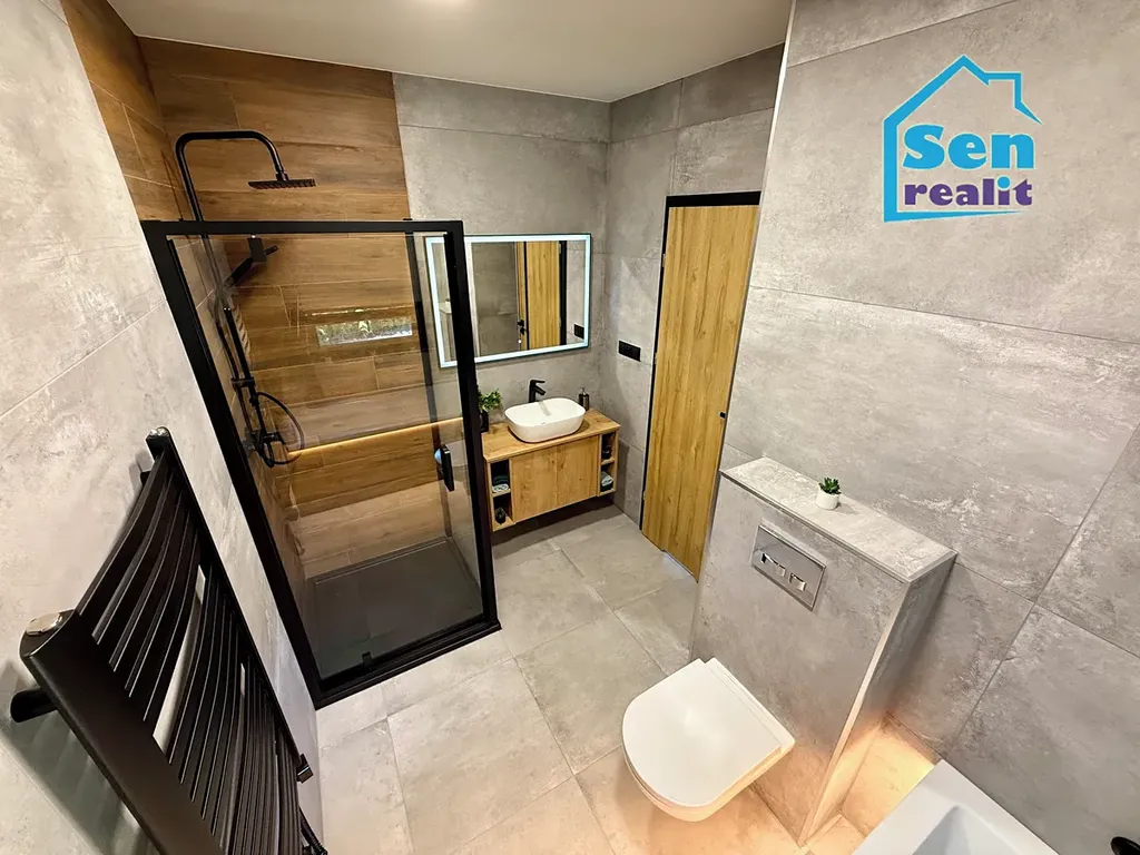 Moderní koupelna se sprchovým koutem, WC a podsvícenou vanou