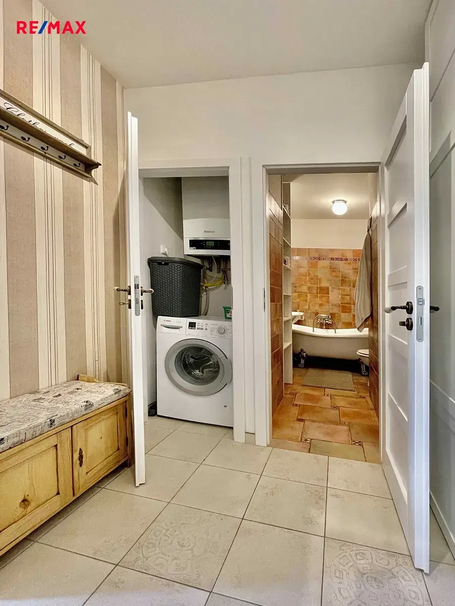Koupelna s vanou umyvadlem a WC. Samozřejmostí je též pračka.