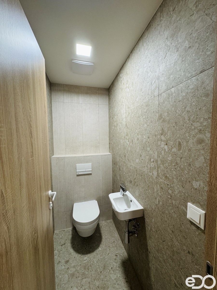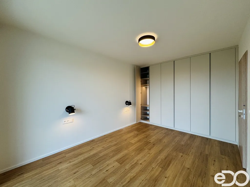 Byt se nachází v cihlové novostavbě a čeká na své první nájemníky. Moderní dispozice nabízí prostorný obývací pokoj s kuchyňským koutem, ložnici, předsíň, koupelnu s vanou a samostatnou toaletu s umyvadlem. Z obývacího pokoje i ložnice je vstup na lodžii o výměře 6,1 m², která poskytuje příjemné místo k relaxaci. Jednotka je orientována na jihozápadní stranu. Součástí bytu je moderní kuchyňská linka, která je vybavena veškerými spotřebiči: elektrická trouba, indukční varná deska, digestoř, myčka a lednice s mrazákem. V ložnici je k dispozici prostorná vestavěná skříň, v předsíni pak skříně s dalším úložným prostorem. Vytápění je zajištěno tepelným čerpadlem, stejně jako ohřev vody. Okna a dveře k lodžii jsou hliníková, podlaha pak vinyl a keramická dlažba. K bytové jednotce dále náleží zděný sklep (2,7 m²) a garážové stání, které je za příplatek 1 800 Kč měsíčně.