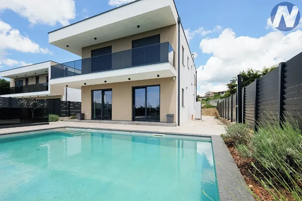 Dům se nachází v lokalitě půvabného městečka Svetvinčenat. Dům je nově postaven v moderním stavebním stylu s velkými prosklenými stěnami, kterými proniká hojné světlo. Skládá se ze vstupní haly, kuchyně, jídelny, toalety, technické místnosti, obývacího pokoje s krbem a přístupu na venkovní terasu, kde je venkovní bazén se sluneční terasou pro relaxaci a zábavu. Vnitřní schodiště zároveň spojuje 1. patro, kde jsou 4 prostorné a světlé ložnice se 4 moderními a plně vybavenými koupelnami.