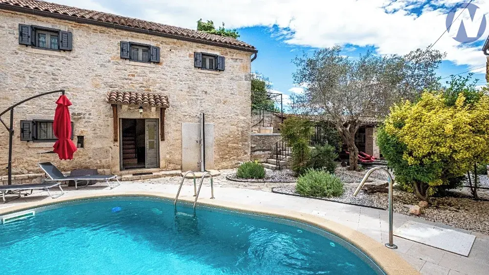 Tento unikátní objekt se skládá ze dvou samostatných budov, autentických kamenných domů, které byly kompletně zrekonstruovány a vybaveny velkým důrazem na detail. Každý dům má vlastní vchod, zatímco mají společný prostorný a dobře navržený venkovní prostor. Najdete zde bazén s moderní solární sprchou, prostor pro opalování, idylická místa pro posezení a socializaci a krytou terasu s grilem až pro 12 osob, ideální pro letní posezení. Vstup do dvora zdobí olivovníky a na pozemku je zabezpečené soukromé parkoviště pro 4 auta.