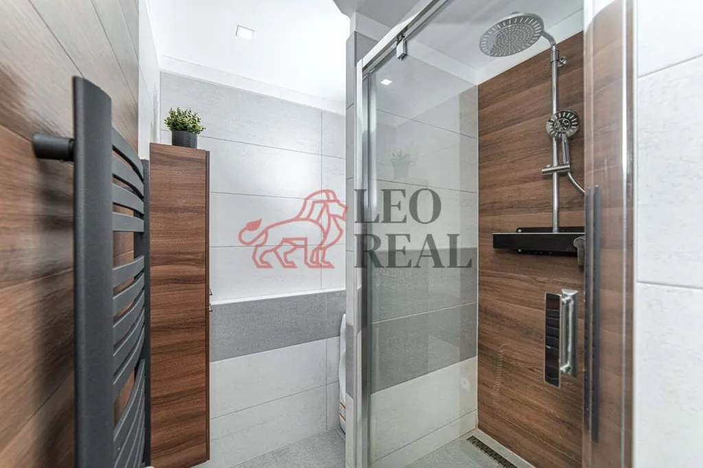 Koupelna je zděná, s moderním sprchovým koutem a WC. Najdete zde koupelnovou skříňku s umyvadlem, zrcadlo s osvětlením, elektrický topný žebřík a praktický prostor pro pračku i sušičku.