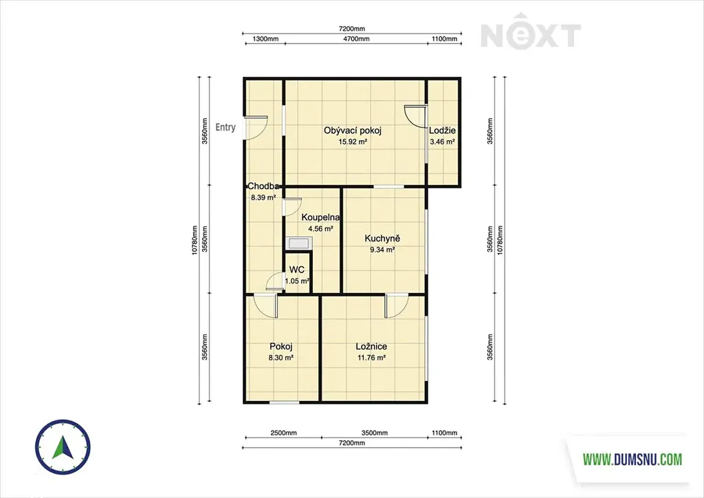 Dispozice bytu je praktická a vzdušná – z chodby se vchází do koupelny se sprchovým koutem, samostatné toalety a jednoho z pokojů. Dále je zde obývací pokoj s lodžií, kuchyně s vestavěnými spotřebiči a další pokoj. Všechny místnosti jsou orientovány na východ, takže je byt po celý den příjemně prosvětlený.