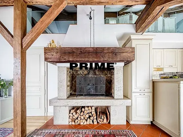 Dispozice dolního podlaží bytu: vstupní hala, obývací pokoj s krbem, jídelní částí, vstupem na terasu a s otevřenou plně vybavenou kuchyní se spotřebiči (sklokeramická varná deska, elektrická trouba, lednice s mrazákem a myčka), jedna ložnice a velká koupelna (s vanou, toaletou, umyvadlem a bidetem). Na galerii vedoucí z obývacího pokoje je druhá ložnice s pracovním koutem.