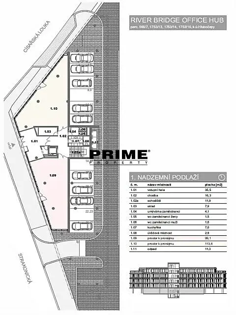 Nové obchodní prostory k pronájmu, 113,6m2, situované v přízemí v nově vznikající moderní administrativní budově River Bridge Office Hub. Objekt je součástí areálu River Business Centre a nachází se na rozhraní Smíchova a Hlubočep, na břehu Vltavy, u rozestavěného Dvoreckého mostu, přímo u rychlostní silnice R4, naproti zastávce tramvaje a stanici autobusu, nedaleko stanice metra a vlakového nádraží Smíchovské nádraží, 5 minut na dálnici D5 a 6 minut na dálnici D1.