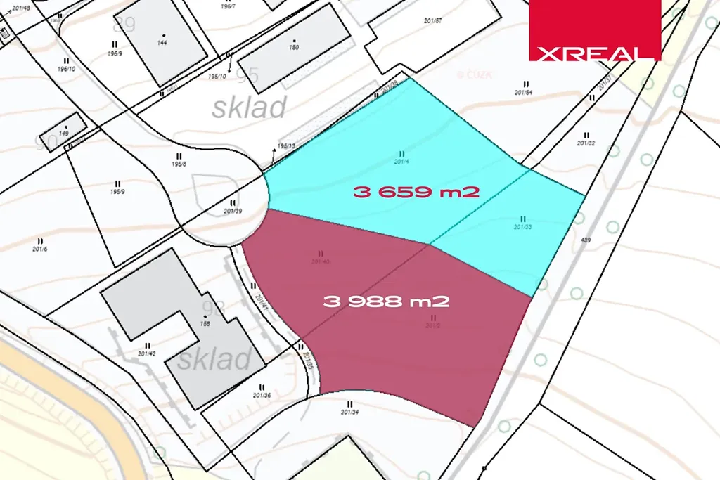Pozemky lze využít i odděleně ve 2 částech s výměrou 3 659 m² a 3 988 m² anebo na míru, dle domluvy.