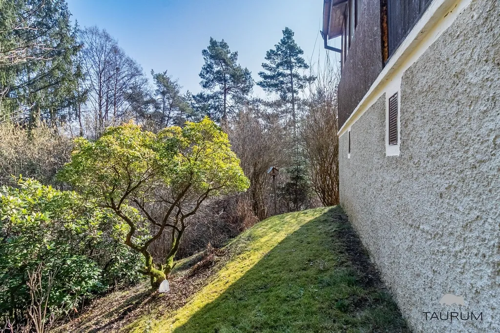 Chata stojí na vlastním pozemku o rozloze 270 m2 s okrasnými dřevinami a krytou pergolou.
