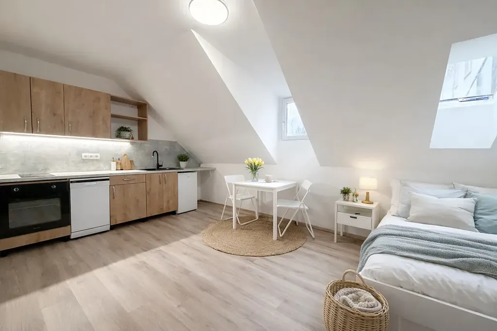 Byt disponuje vstupní chodbou, moderní koupelnou se sprchovým koutem a pračkou. Hlavní obytný prostor je prakticky řešen a nabízí plně vybavenou kuchyňskou linku se spotřebiči – troubou, myčkou nádobí, vařičem a dostatkem úložných prostor. Součástí vybavení je dále rozkládací postel s úložným prostorem a šatní skříň. Byt je po kompletní rekonstrukci a připraven k okamžitému nastěhování bez nutnosti dalších investic.