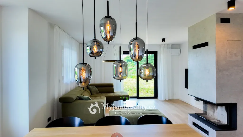 Dominantou interiéru je velkorysý obývací prostor propojený s kuchyní a jídelnou. Designová kuchyň je vybavena pracovní deskou z kamene Technistone a vestavnými spotřebiči Whirlpool a Electrolux. Interiér i exteriér podtrhuje velké množství skleněných prvků, které dodávají domu vzdušnost, světlo a moderní elegantní charakter. Celý dům je realizován z kvalitních, nadstandardních materiálů s důrazem na dlouhou životnost a precizní zpracování. Vysoký standard provedení dále tvoří vinylové podlahy, bezfalcové interiérové dveře s magnetickým dovíráním, velkoformátová okna s izolačními trojskly, elektricky ovládané venkovní žaluzie, klimatizace ve všech obytných místnostech a moderní kamerový systém.