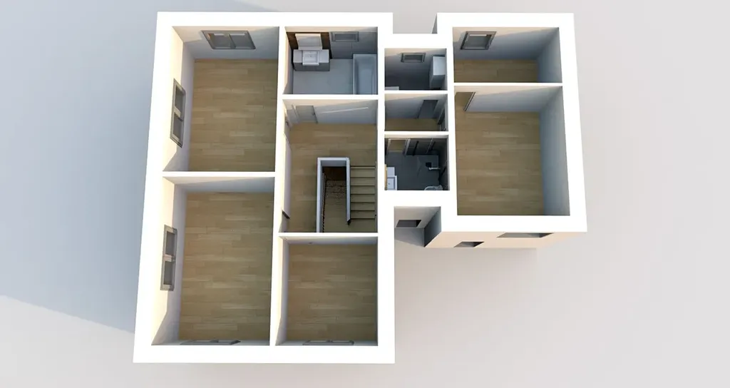 Dvoupodlažní budova sestává v přízemí ze zádveří 3,53 m2, chodby se zázemím 8,18 m2, prostorné obývací místnosti 46,44 m2, kuchyně 11,79 m2, toalety 1,48 m2, umývárny 2,16 m2 a garáže 20,94 m2. Celková užitná plocha 94,52 m2.