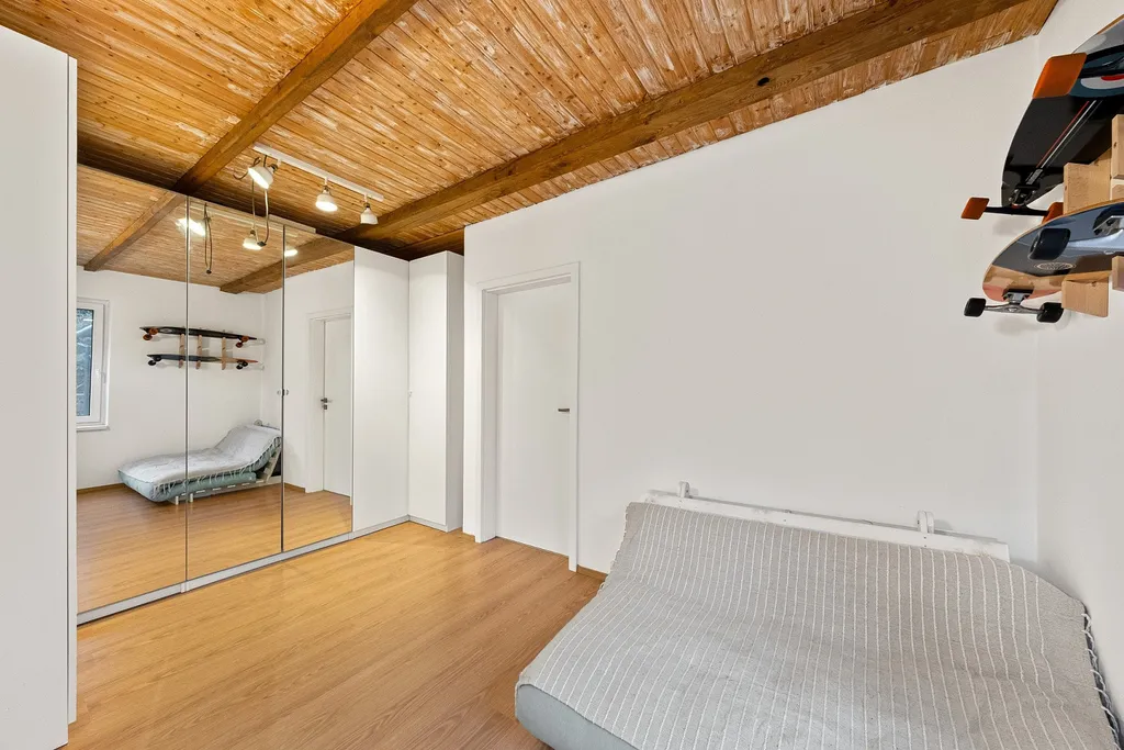 Schodiště kolem krbu vás zavede do podkroví, kde se při vstupu otevírá dřevěný prostor vhodný jako pracovna, relaxační zóna nebo místo pro klidné posezení. Navazuje na něj samostatný prostorný pokoj s menší šatnou a dalším praktickým úložným prostorem.