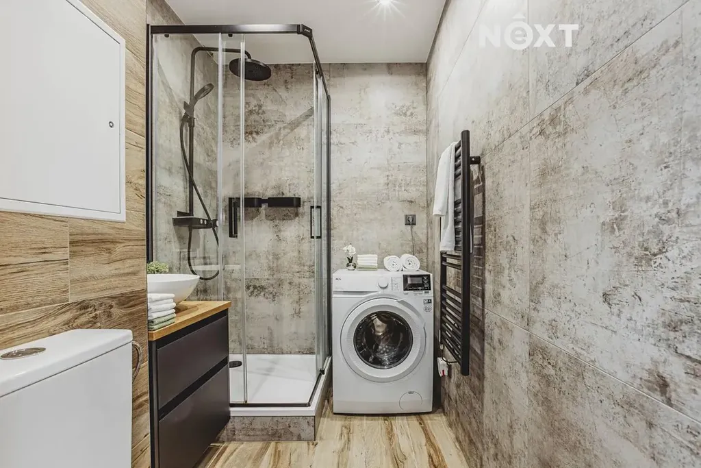 Koupelna o velikosti 3,6 m² (2,43 × 1,66 m) je kompletně zrekonstruovaná, s moderním sprchovým koutem a místem pro pračku i sušičku. Celkové provedení bytu je sladěné, čisté a bez nutnosti dalších investic.