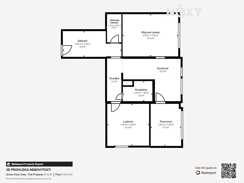 Dispozice je funkční a promyšlená. Vstupujete do prostorného zádveří o velikosti 8,9 m² (4,84 × 2,12 m), zde se nachází velkorysá vestavná skříň na pohodlné odložení věcí. Navazuje technická místnost 2,8 m² (1,19 × 2,32 m), ideální jako komora nebo praktické úložné zázemí.