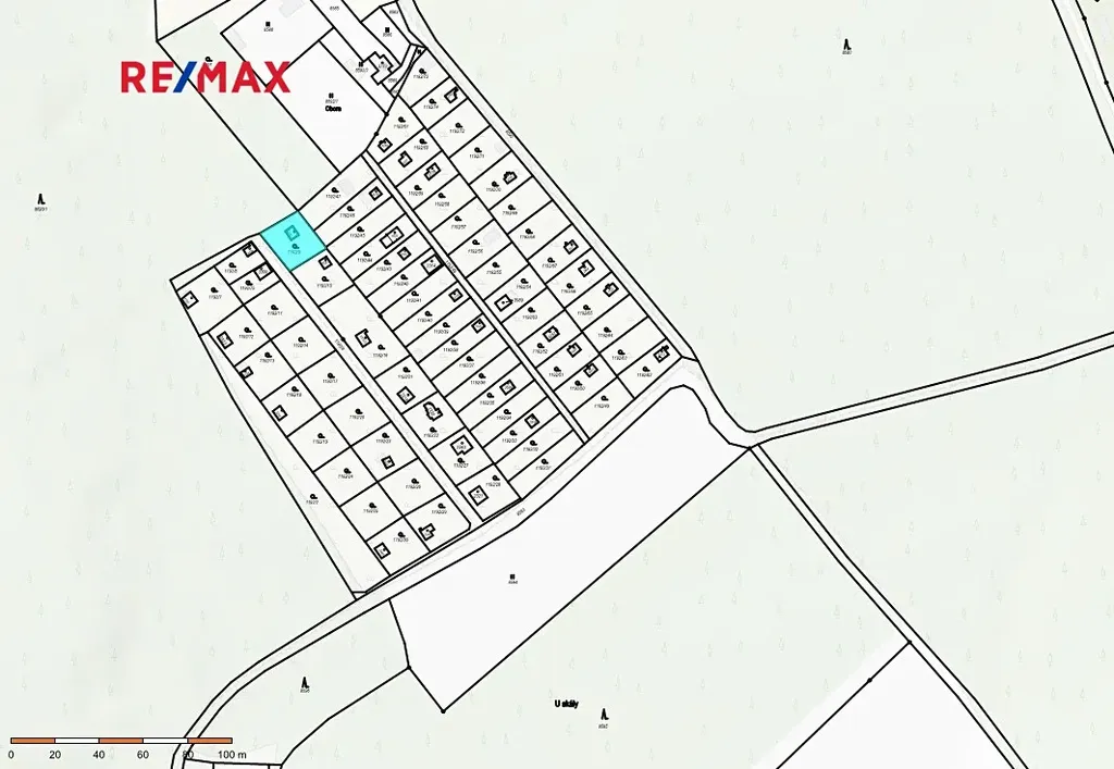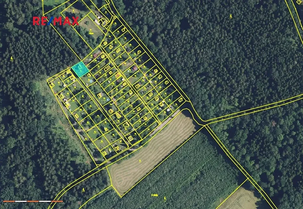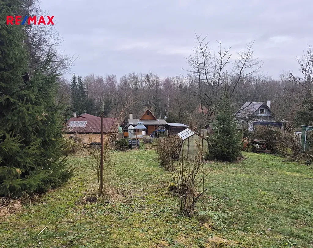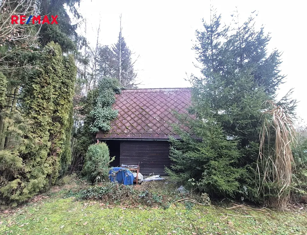 K chatě patří udržovaná oplocená zahrada téměř rovinatého terénu o výměře 404 m2.