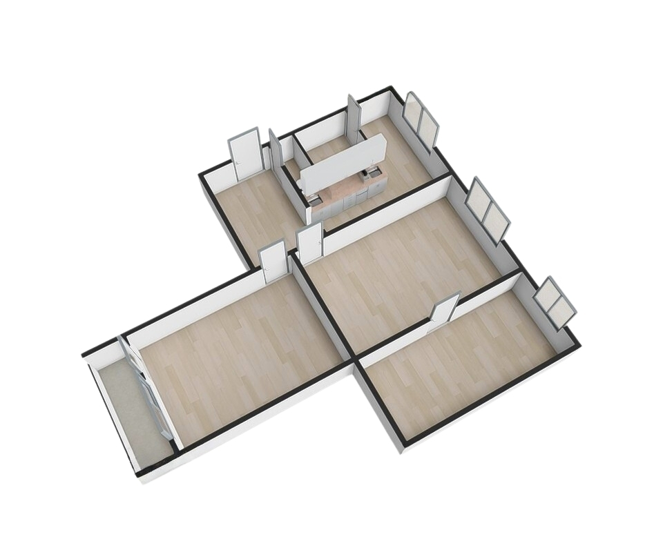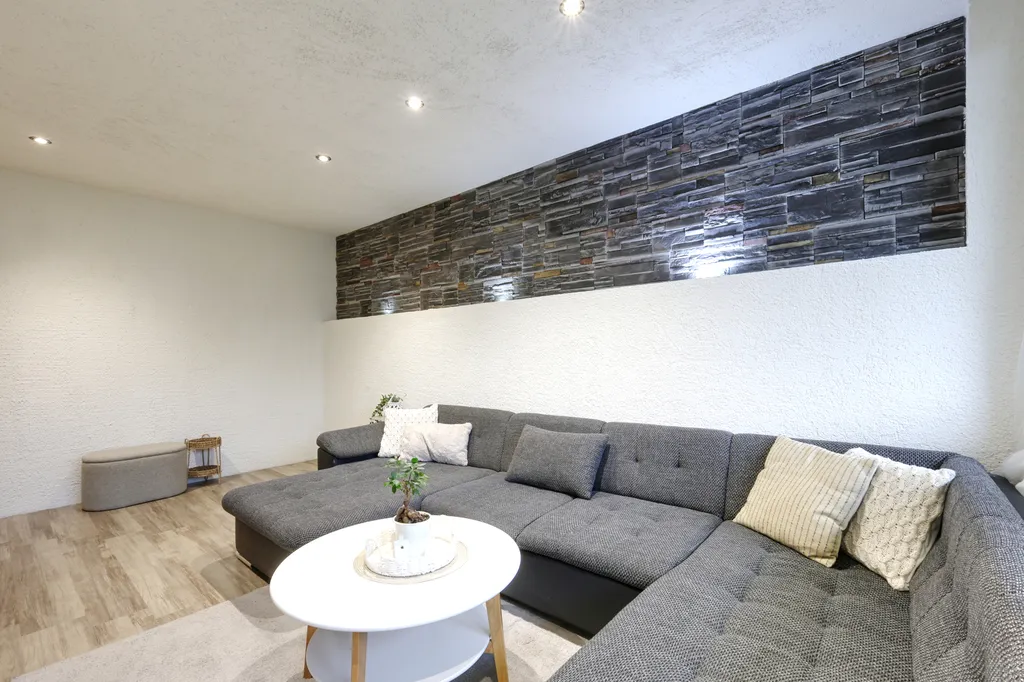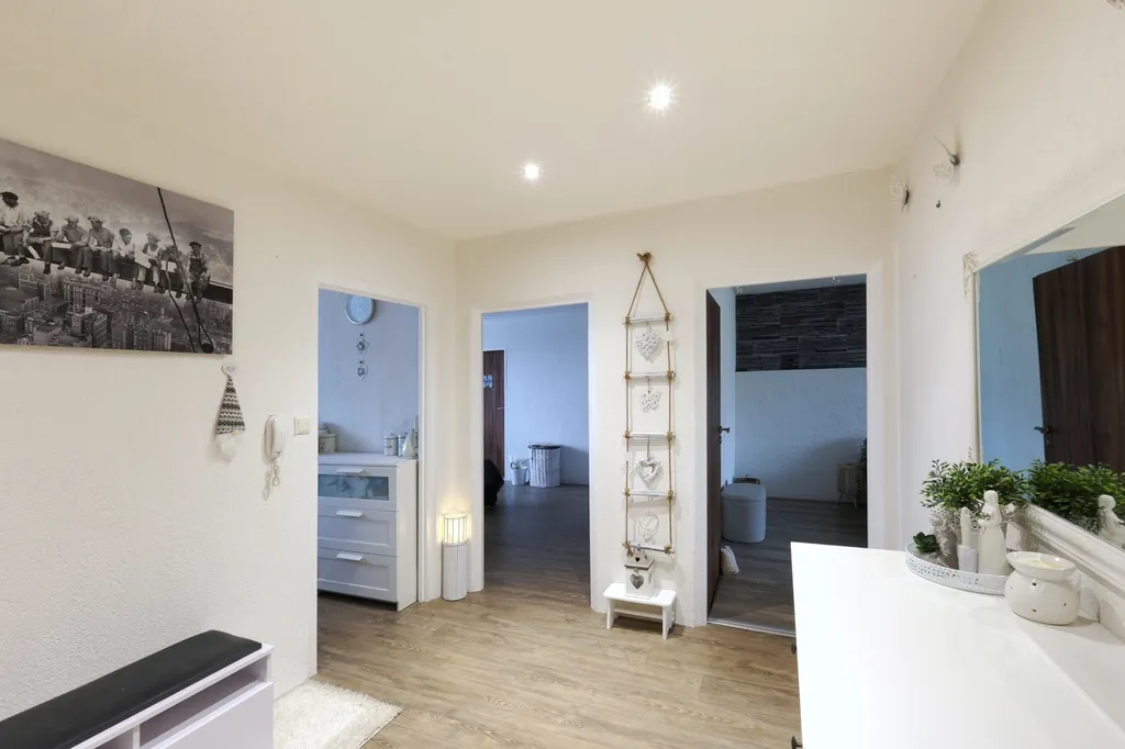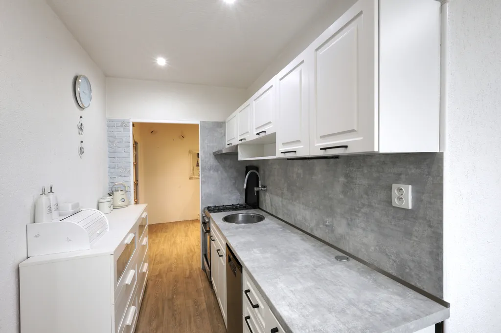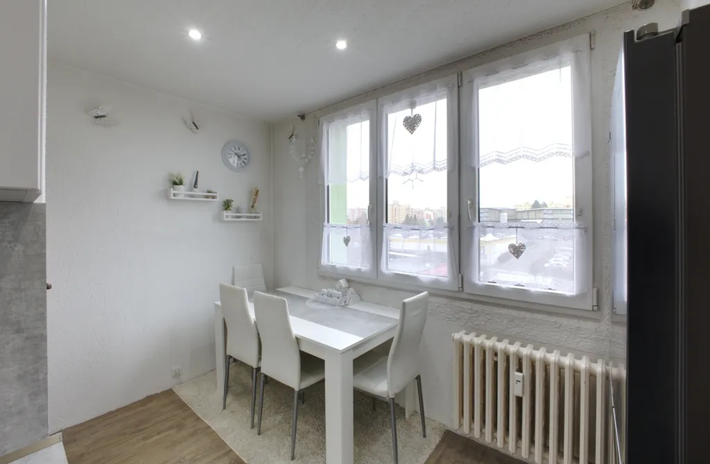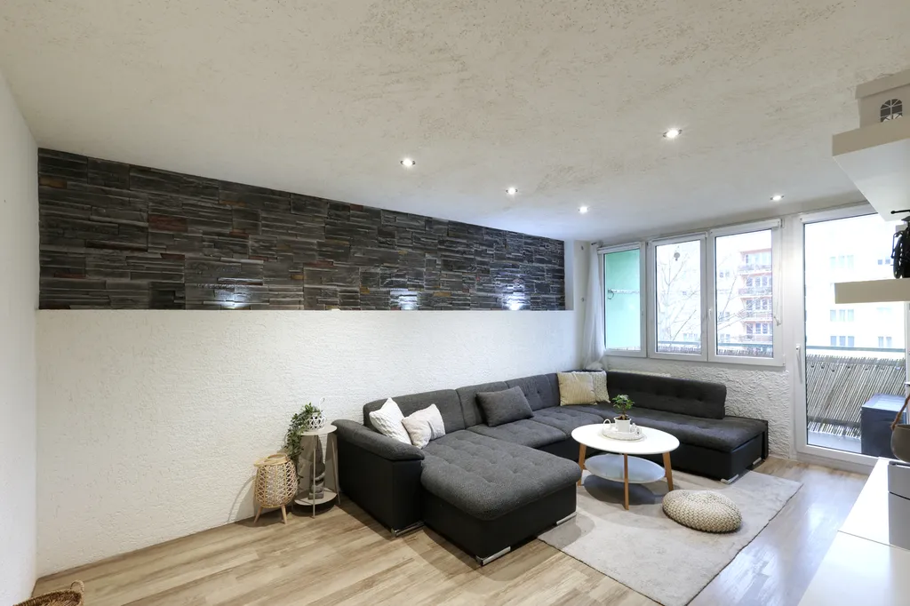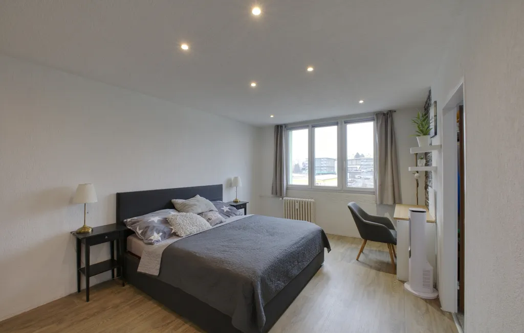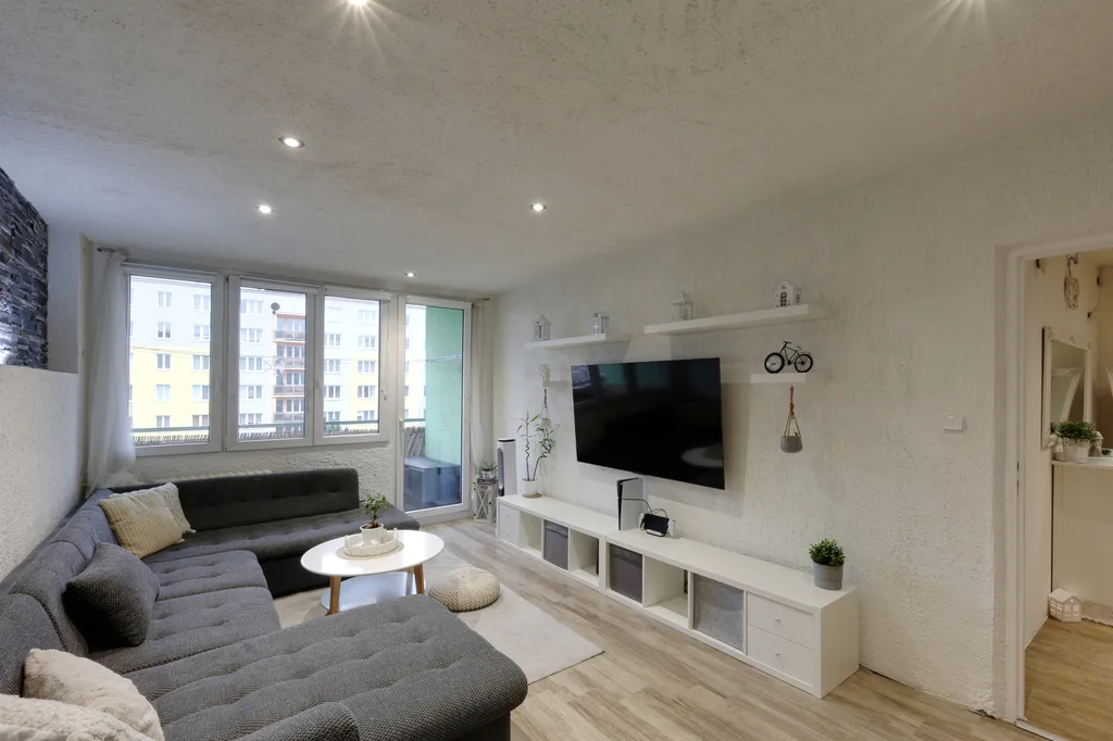 Byt je umístěn ve 4. patře zatepleného panelového domu. Interiér působí moderním dojmem díky sníženým stropům s bodovým osvětlením a dekorativním omítkám. V ložnici a obývacím pokoji jsou použity obklady v dekoru kamene. Lodžie je přístupná z obývacího pokoje. Ložnice, dětský pokoj a kuchyně jsou orientovány na sever. V obytných místnostech je položena plovoucí podlaha, v dětském pokoji koberec. Koupelna je v moderní šedo-bílé kombinaci a nabízí dostatek prostoru pro umístění pračky i sušičky. Kuchyňská linka je vybavena plynovým sporákem, digestoří a myčkou. Praktickým prvkem je prostorná obdélníková předsíň.