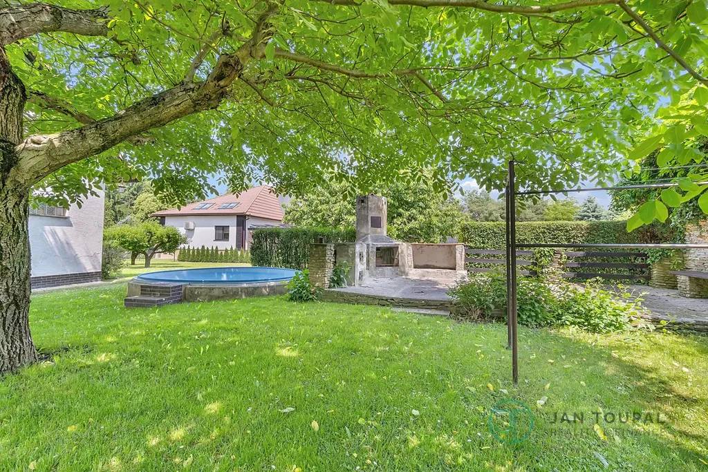 Zázemí pro relaxaci: Na zahradě najdete zapuštěný bazén a venkovní posezení s krbem.