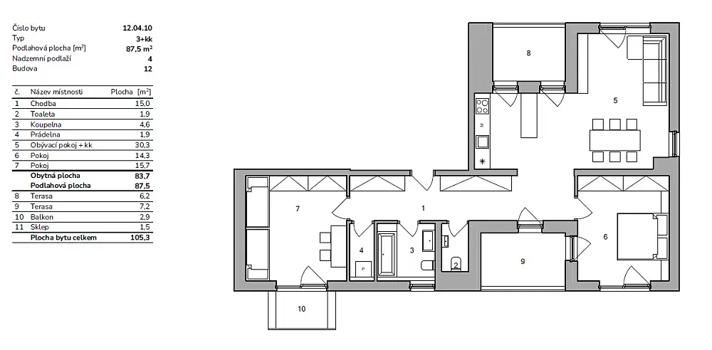 Plocha bytu 87,5 m2, terasa č.1 6,2 m2, terasa č.2 7,2 m2, balkon 2,9 m2, sklep 1,5 m2