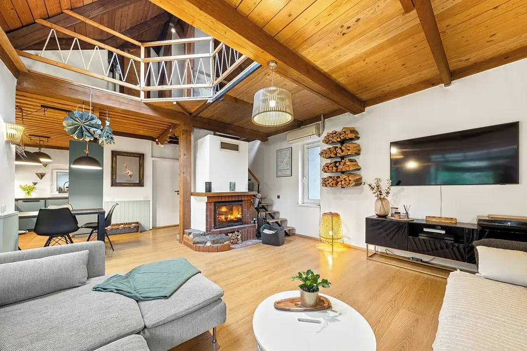 Vstupní zádveří nabízí prostor pro šatnu a navazuje na hlavní obytnou část domu s dominantním krbem, který tvoří přirozené centrum celého interiéru. Velkým estetickým i praktickým prvkem je otevřené celodřevěné patro, které dodává domu charakter a pocit vzdušnosti. Kuchyně je otevřená a plynule propojená s obývacím pokojem, odkud se dostanete do ložnice. V přízemí se dále nachází koupelna po nedávné rekonstrukci.